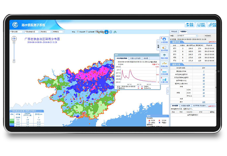 利用主流的云计算、大数据等技术,将客户值班会商关注的雨情、水情、墒情、视频、报汛质量等所有信息集中于一个平台集中监视,支持自动生成 40 种以上报表产品,为水情值班提供科学支撑,用户覆盖黑龙江、广西、贵州、山东、山西、宁夏等地。