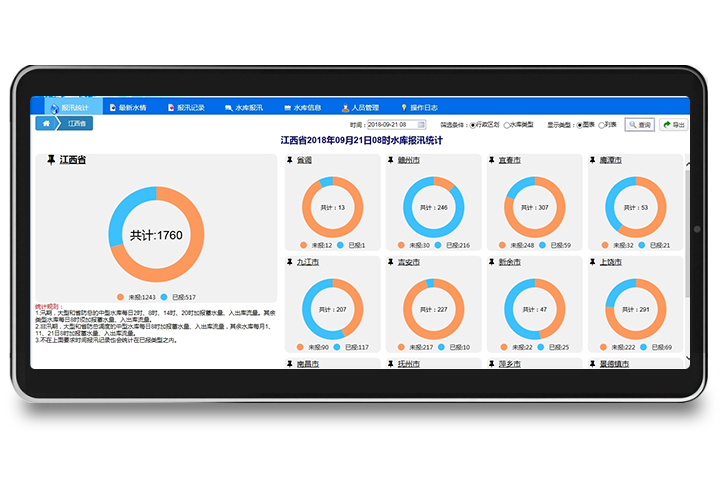 根据各地报汛要求灵活设置上报要素,具有省市县乡水库五级管理单位分级管理、自动计算库容、入库、出库信息、自动汇总上报情况等功能,为防汛决策提供支撑,用户覆盖江西、 广西、吉林、山西、宁夏、新疆等地。